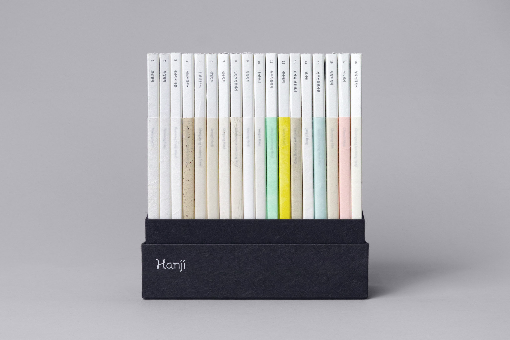 “視覺元素基于‘不均勻、靈活的線條’,體現(xiàn)了Hanji的成分、生產(chǎn)過程和最終形式。這條線條是韓吉制作者的身體動(dòng)作、桑紙纖維、未切割的自然邊緣的精致或印章的印象中的主題。除此之外,標(biāo)志設(shè)計(jì)以輕盈優(yōu)雅的字體形式完成項(xiàng)目的意圖是在當(dāng)前時(shí)代繼續(xù)和發(fā)展韓吉的傳統(tǒng)遺產(chǎn)。這些線條還可以作為一種圖形裝置,描繪來自大自然的Hanji材料及其永恒的時(shí)間流動(dòng)。”–工作室fnt
