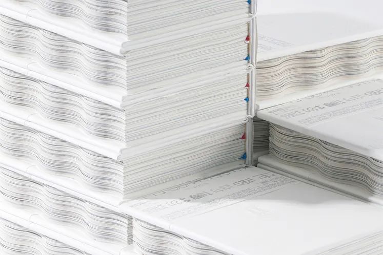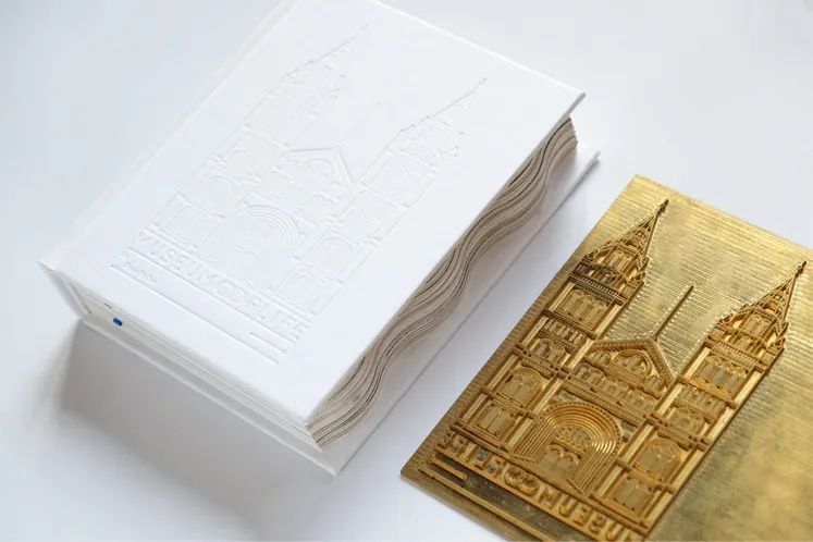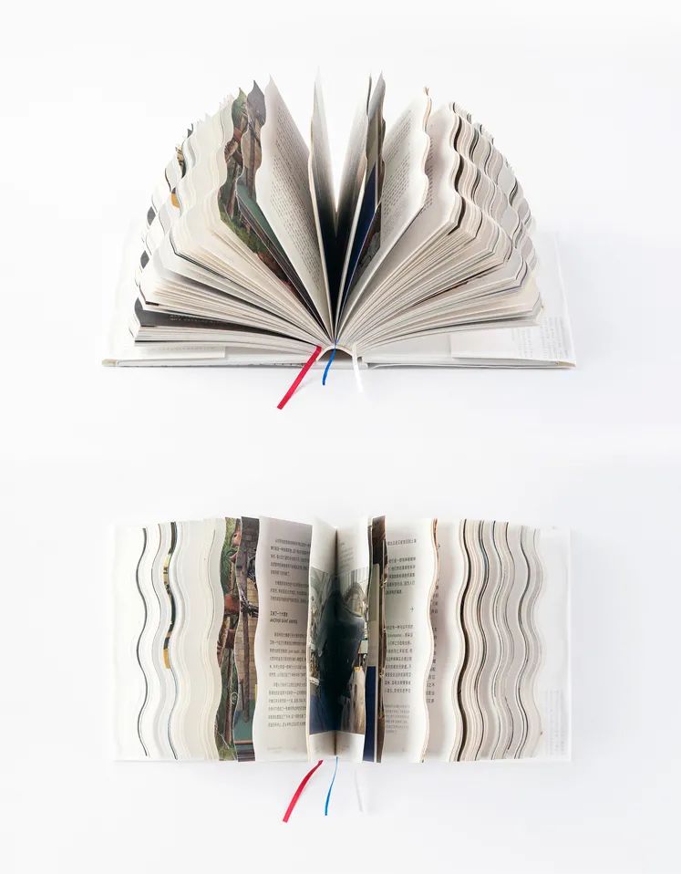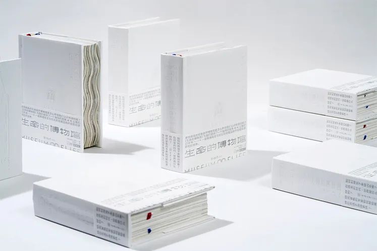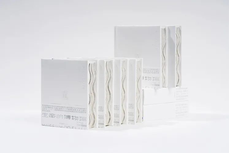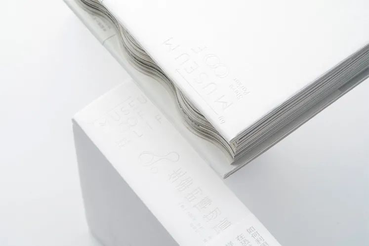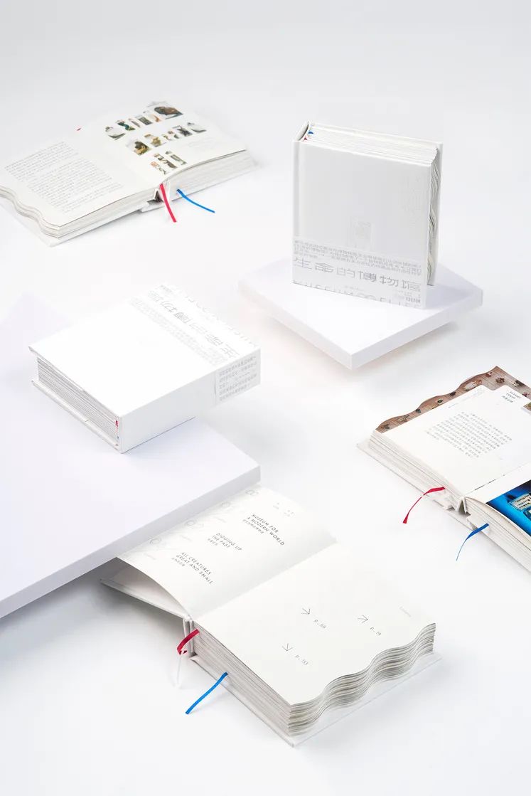 這本書被設(shè)計(jì)成很小的尺寸。書籍邊緣特別設(shè)計(jì)成波浪的形狀,使書本身有了更生動的“立體感”和“流動性”。紅色、白色和藍(lán)色的帶狀書簽也是生命的動脈和脈絡(luò)的象征。書,從它的內(nèi)部到外部,呈現(xiàn)大量的純白色。封面上的信息油墨印刷的,而是采用壓印工藝呈現(xiàn)在紙上的,直觀地表達(dá)了人們在博物館行走的感受,質(zhì)樸自然,同時,也傳達(dá)出了從小細(xì)節(jié)到大畫面對自然生活的觀照。我們必須用心觀察我們自己眼睛里的自然,然后才能想象出一個不同的場景。